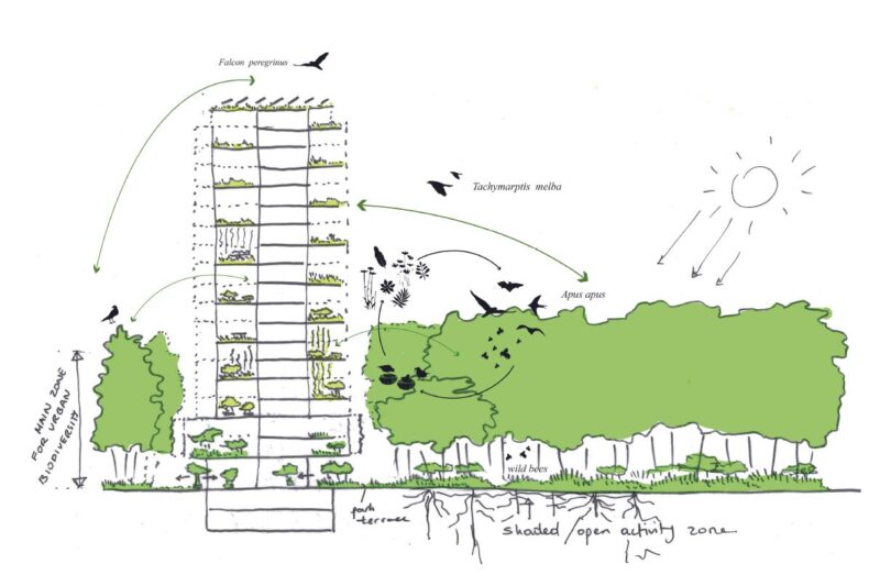 Das Hochhaus integriert die Natur direkt in den Alltag seiner Bewohnenden. Wintergärten, begrünte Dachterrassen und der angrenzende Richard-Ernst-Park machen die Natur in jedem Bereich des Towers erlebbar. Diese Elemente tragen